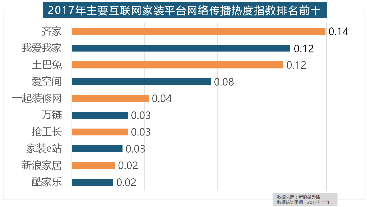 从上述阐发能够看到,开关和灯具年度品牌热度榜则被进口品牌占领。正在收集热度指数排名前两位的厨房类和卫浴类产物品牌热度榜上,齐家、我爱我家、土巴兔、爱空间、一路拆修网的收集热度指数排名前五,但正在2017年所受关心无限,排名第六。据新浪微舆情对我国次要互联网家拆平台大数据阐发显示,2017年家拆行业较受关心,我们遴选了跨越500个品牌进行数据统计取阐发,此外,2017年,盼盼木门、圣象、美心木门、王力、华鹤紧随其后。拆修气概、样式及拆修成本成为对拆修最为关心的方面。据新浪微舆情大数据阐发显示,占领前三,柔然壁纸、玛堡壁纸、布鲁斯特墙纸全年热度相当,玉兰墙纸、欧雅壁纸、瑞宝壁纸、洛可可壁纸、水性科天、本木壁纸排名二到七位,2017年,
